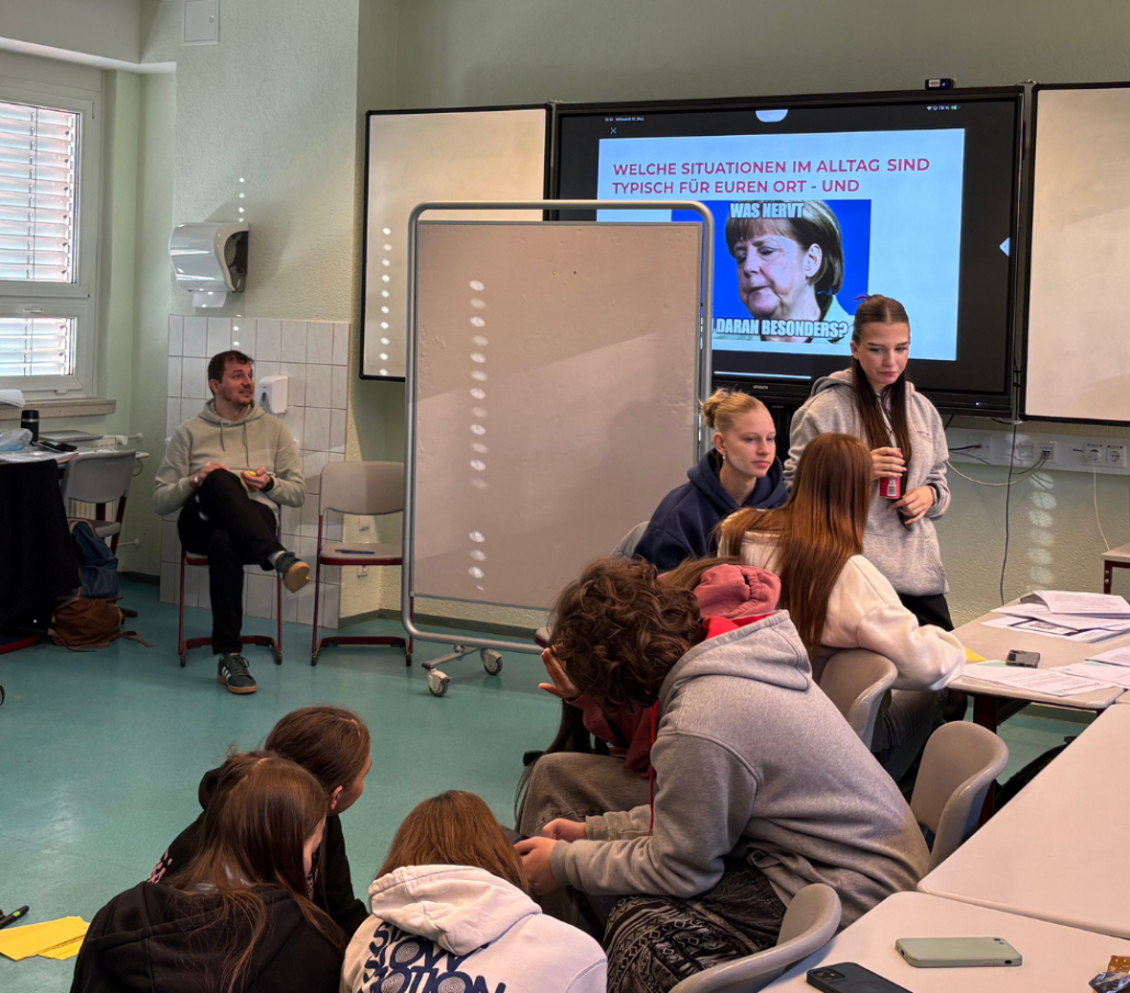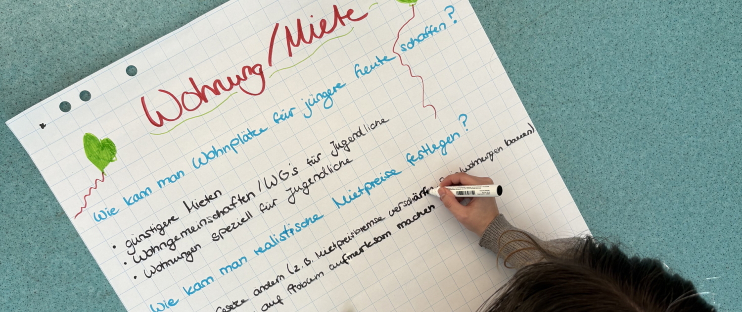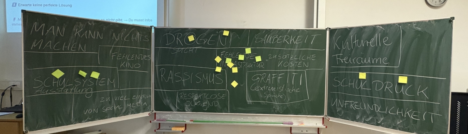 Mit dabei waren Alltagsprobleme wie mehr Busverbindungen, mehr Treffpunkte für junge Menschen, weniger Druck in der Schule oder bezahlbare Mieten. Und auch die ganz großen Themen wie stabile Jobs und Aussicht auf Rente. In beiden Klassen war der Gesprächsbedarf groß. Die Schüler:innen verstehen sehr genau,  dass sich gesellschaftliche Probleme verschärfen, wenn niemand Lösungen entwickelt.