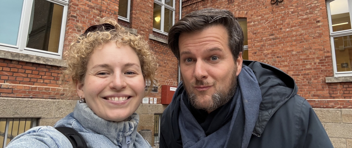 Die Werkstatt-Leiter:innen Henrike Müller-Mahn und Martin Fuchs vor dem Gymnasium in Werdau