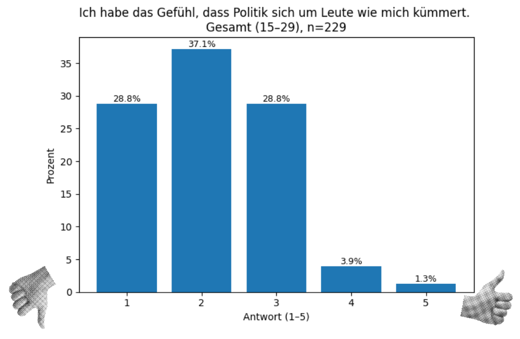 Die Mehrheit der Befragten im Alter von 15-29 Jahren hat nicht das Gefühl, dass Politik sich aktiv um sie kümmert (laut einer Wir sind der Osten-Erhebung im Jahr 2025 unter jungen Menschen in ostdeutschen Bundesländern).